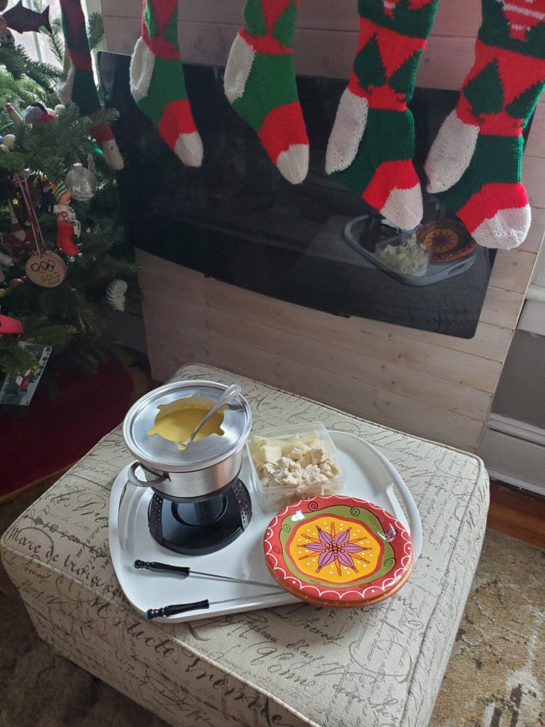 Couldn’t decide what to make for lunch today. Decided on fondue. Enjoyed a picnic of homemade cheese fondue and sliced bread and apple by the Christmas tree.