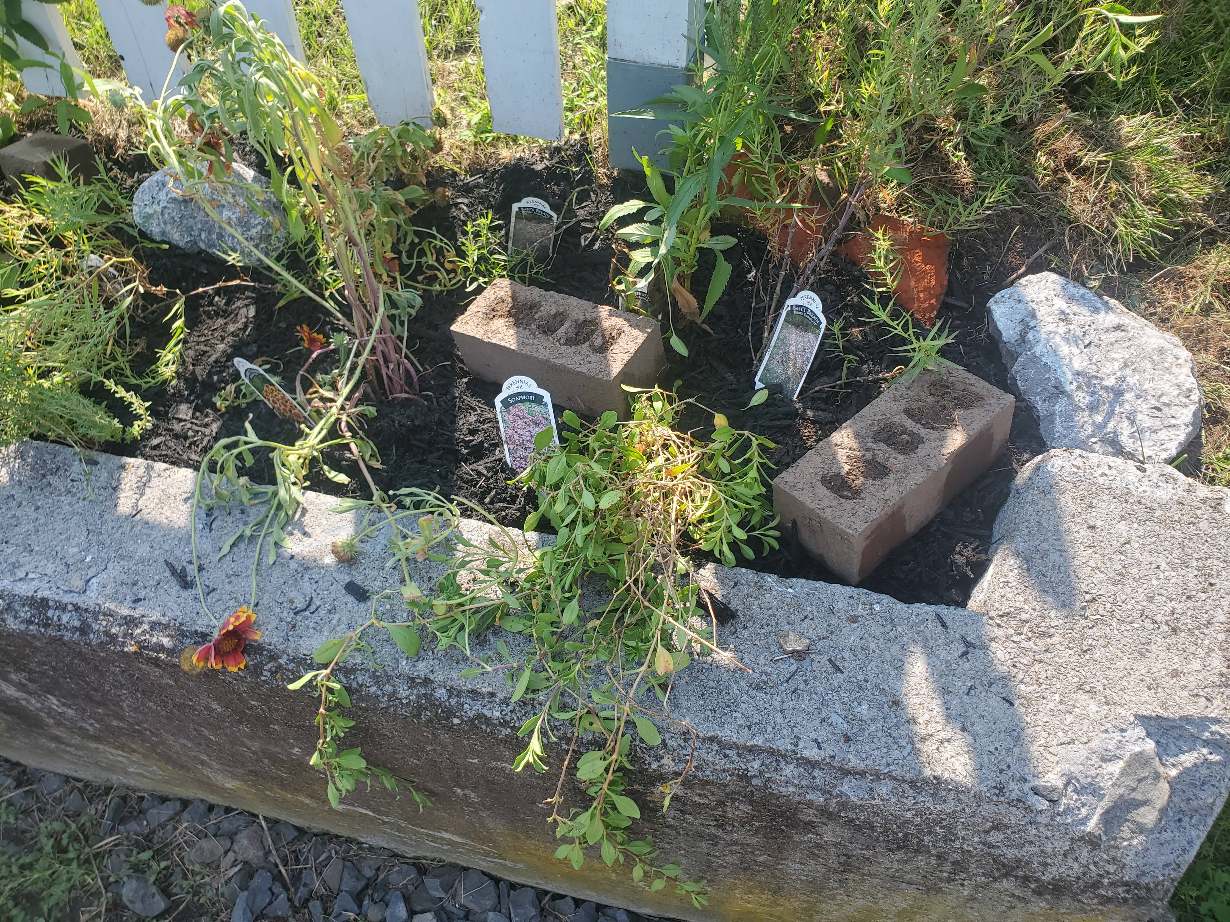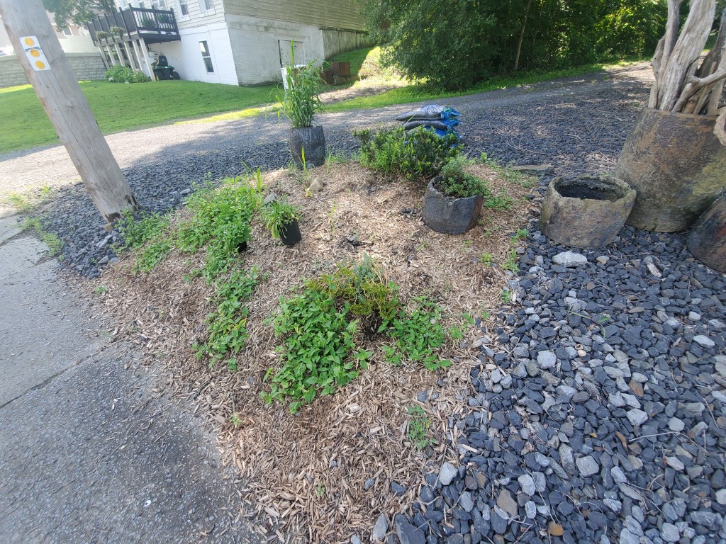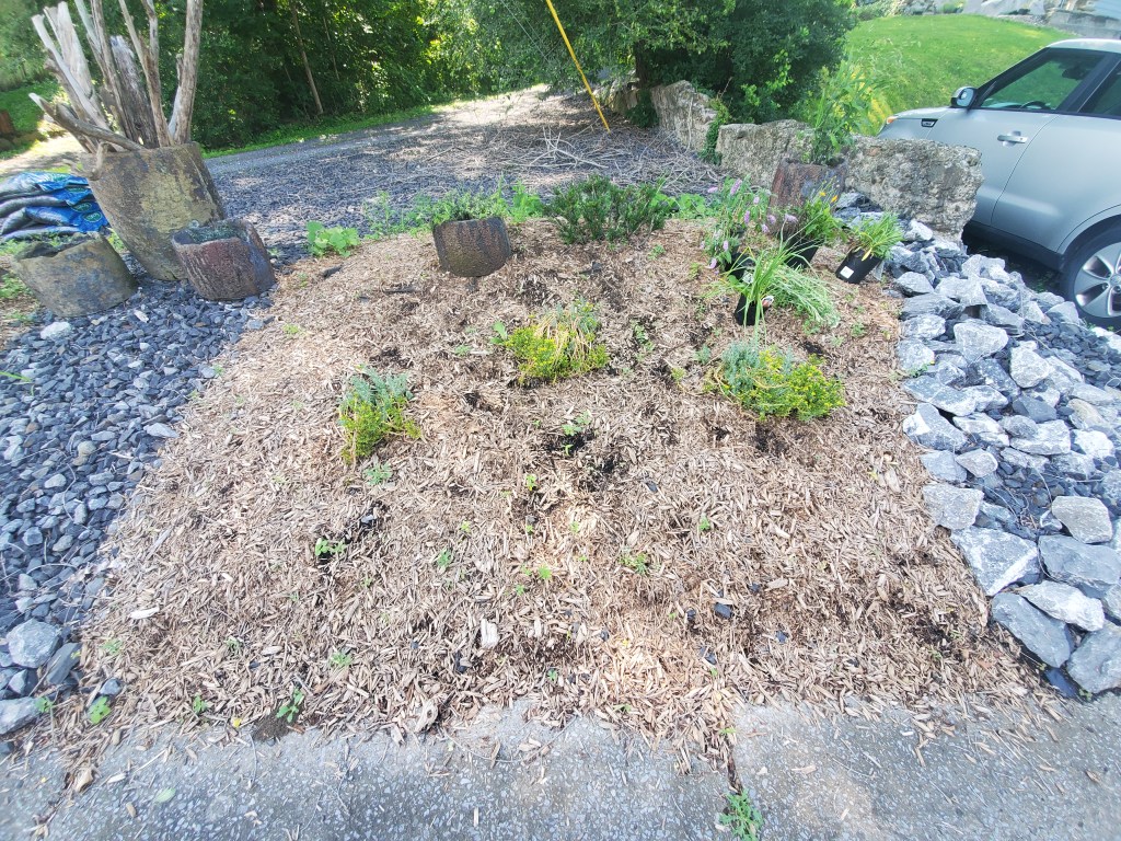 As part of our Instant Garden Makeover, we also decided to tackle an unused eye sore between our two driveways. Although time and effort has gone into planting, mulching, and laying rocks in the past, we knew it was time for an upgrade (although we ran out of mulch) so the project will be completed at a later date.