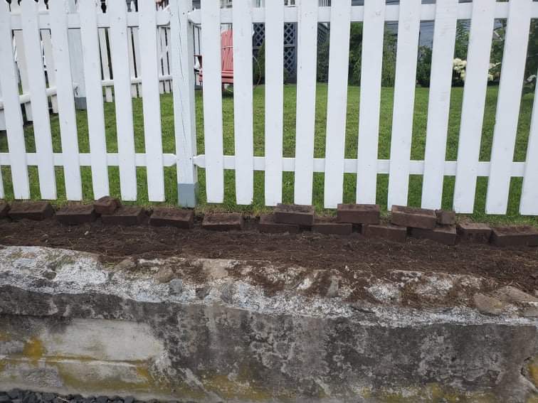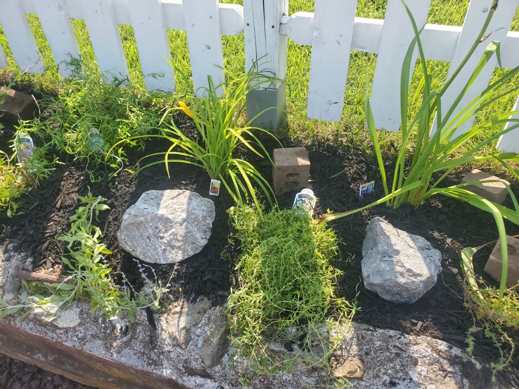 In reimagining our white picket fence addition, we decided to create a 28-ft country garden between the fence and the old foundation. After digging up the grass and tilling the soil, we removed over 40 antique bricks that must have been once part of the old foundation. From there, landscaping paper was laid. Plants were bought from Black Horse Farm and Lowes, both of which had huge markdowns on perennials since it is nearing the end of the season. When we returned, plants were laid out in a classic country garden feel, slices were cut in the landscaping paper, and holes were dug. We decided on black mulch to tie in the new shutters and mulched everything once the perennials were planted. Upon completion, some of the bricks and rocks were recycled as focal points in the new garden (the rest were saved for a later project). The new garden contains perennials like baby’s breadth, soapwart, primrose, yarrow, lupines, lilies, coneflowers, gayfeather, German satice, sea thrift, and much more. And there we have it – the perfect, tranquil front yard to emphasize our home, add curb appeal, and serve as a cutting garden perfect for flower arrangements and attracting pollinators.