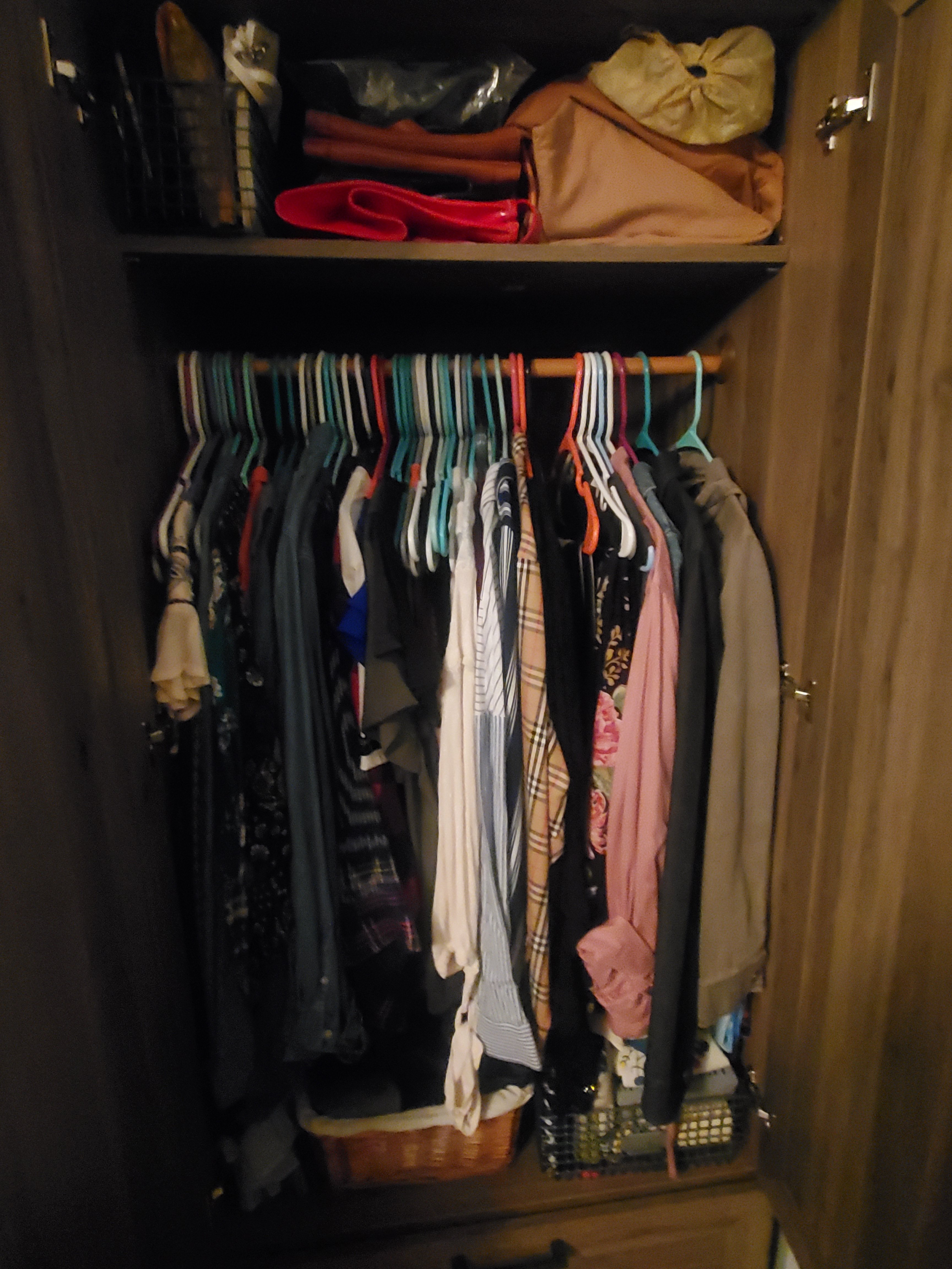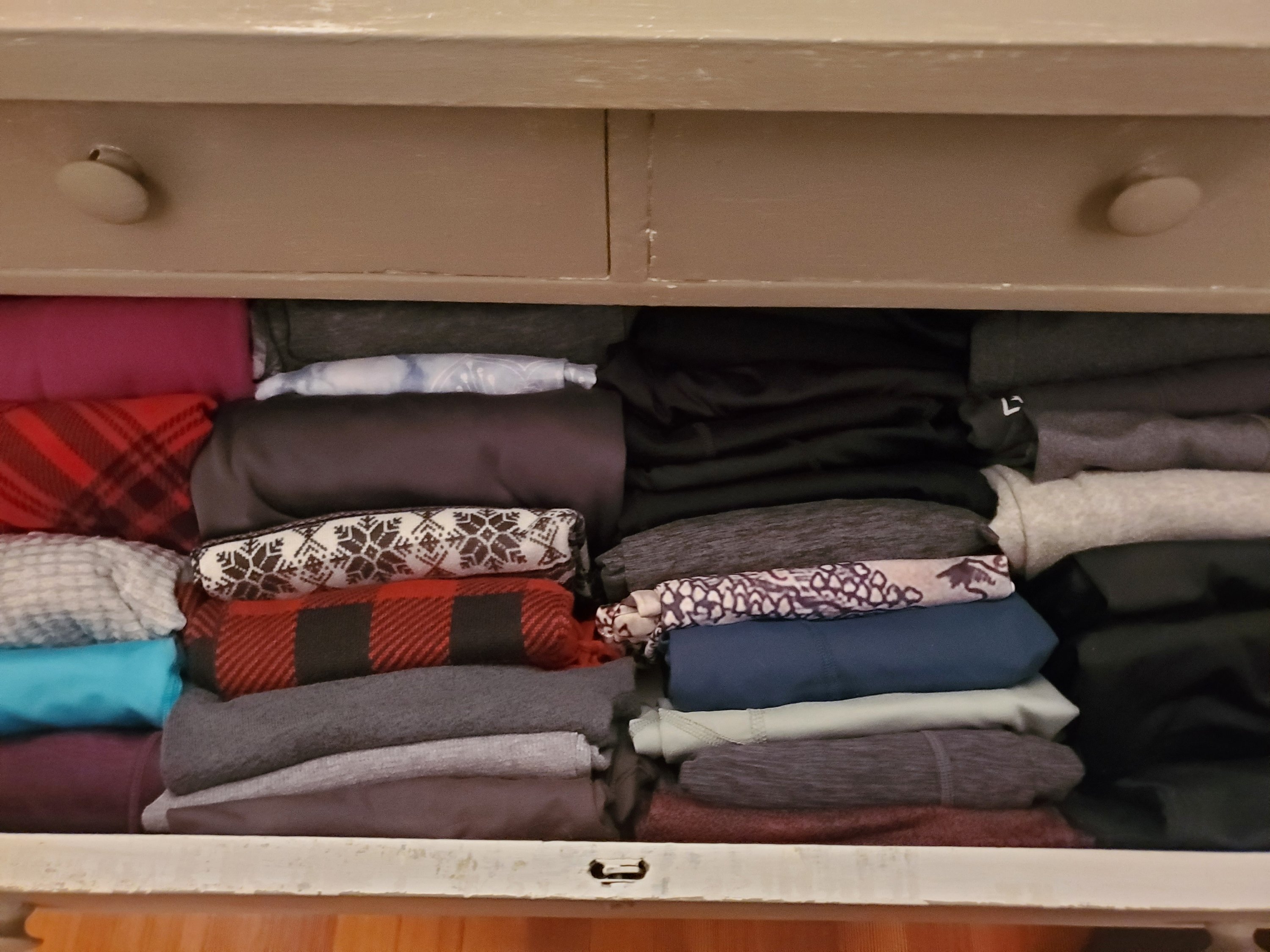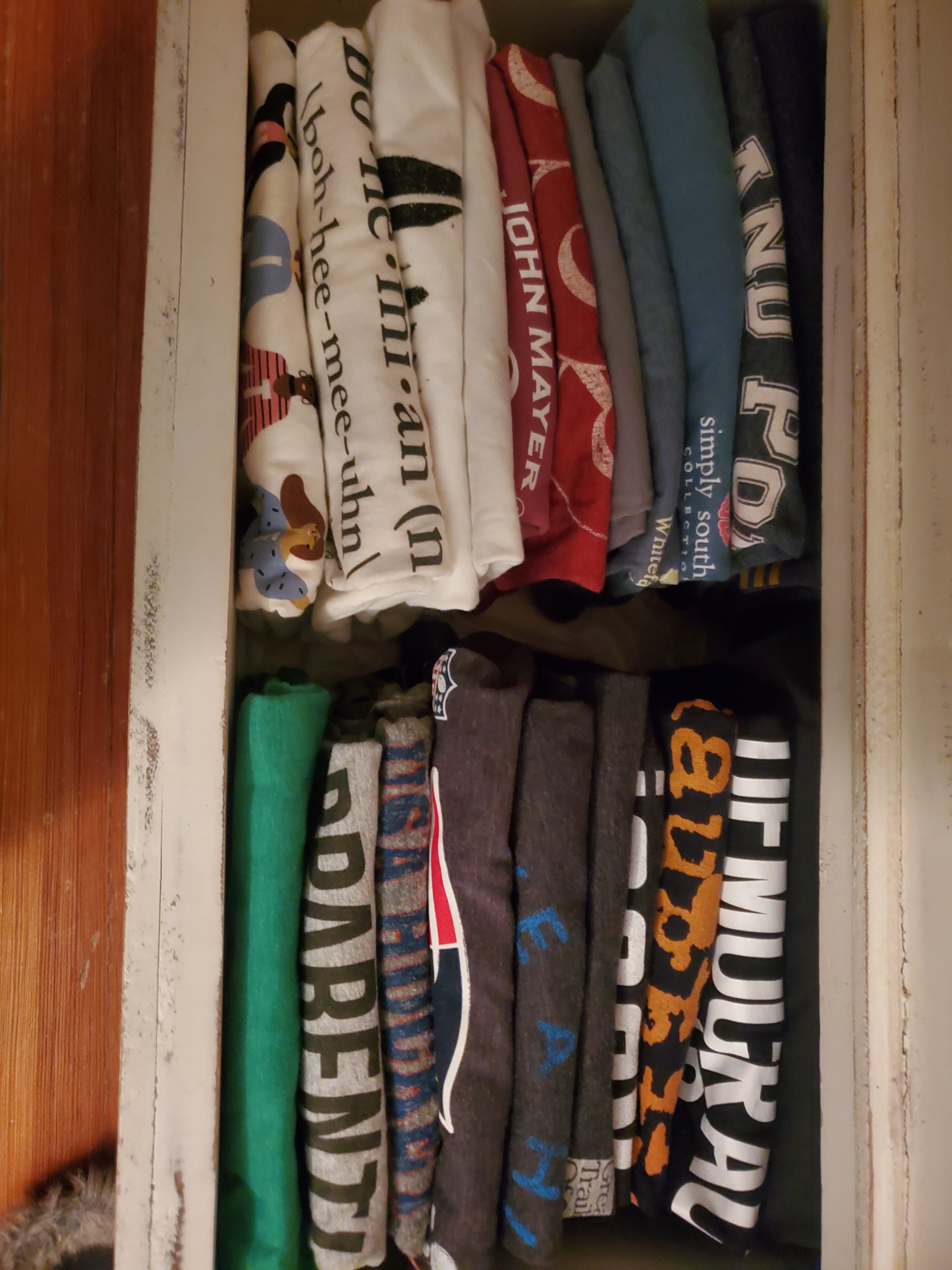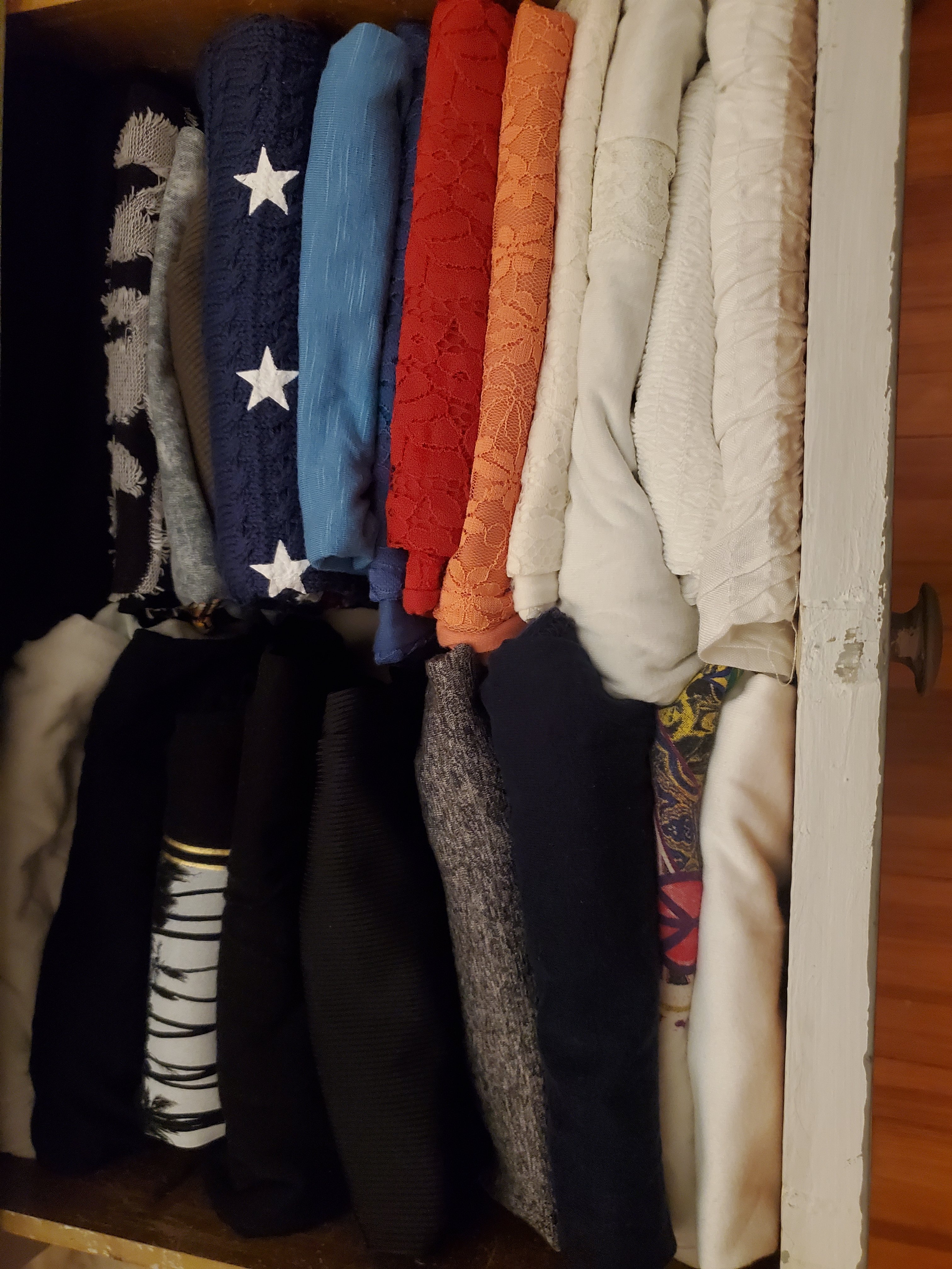 Next came putting everything back. Despite getting rid of many items (most of which we will donate to the thrift store at our Church), how to store everything was the next feat. Using Kondo’s folding techniques (see her book Spark Joy), I was able to better display everything in drawers, piles, and hanging. *The key is to fold into small rectangles. Everything was arranged light to dark – so the lighter colors were the first thing to catch my eye!