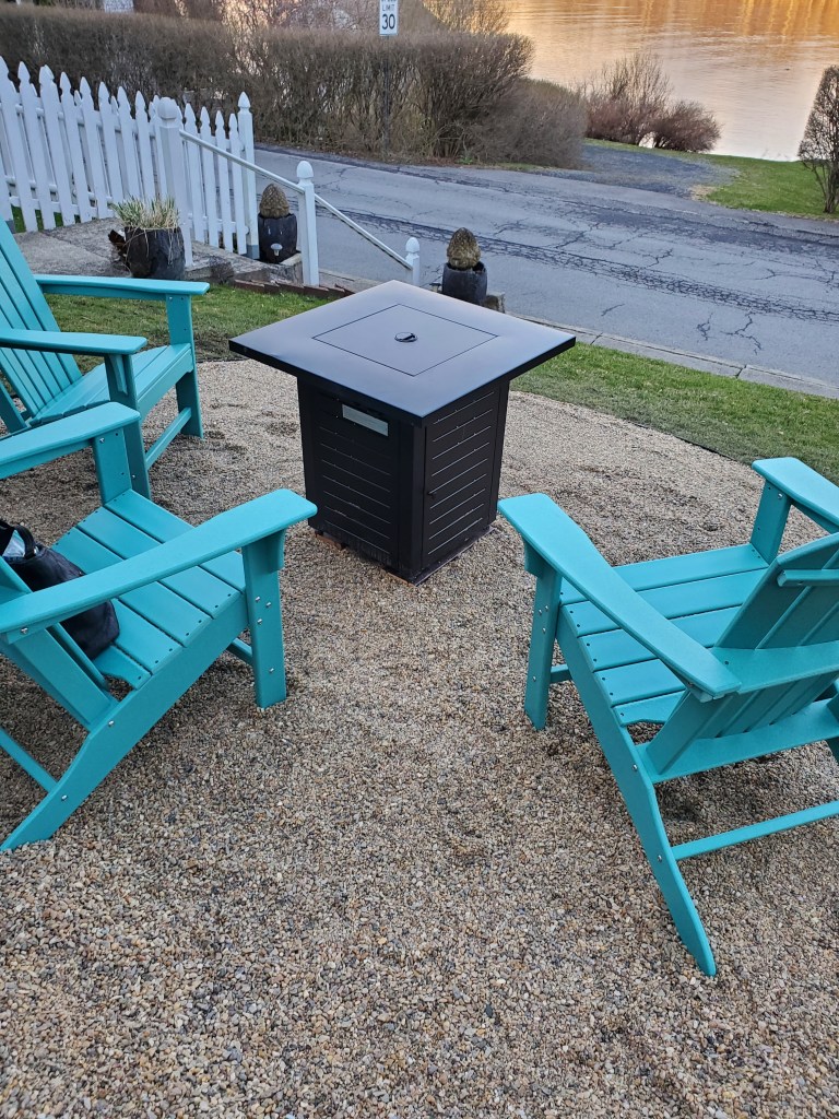 We pulled up the sod, purchased small stone and some edging. The project cost $ 150 plus the cost of the adirondack chairs which I found online on clearance at Home Depot. The project took us about 8 hours. Later this summer we will do some landscaping.